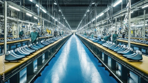 Fototapeta premium Industrial Shoe Manufacturing Process in a Modern Factory with Efficient Assembly Lines and Workers Collaboratively Creating Footwear