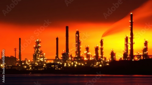 © Matthew, Fototapeta premium Industrial skyline at sunset with glowing lights and smoke, reflecting on water, showcasing energy production