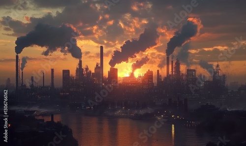 Fototapeta premium Industrial skyline with factories emitting smoke illuminated by a glowing orange sunset creating a dramatic and thought-provoking landscape .