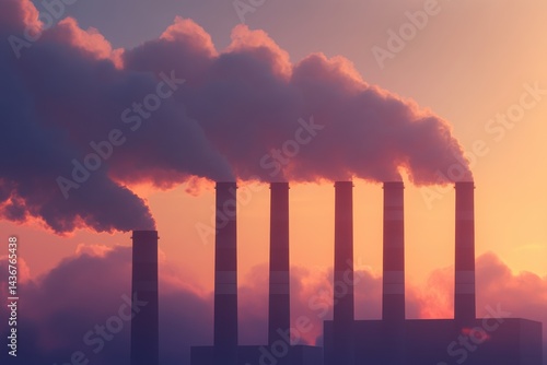 Obraz premium Industrial smokestacks releasing thick smoke at sunset, creating a dramatic...