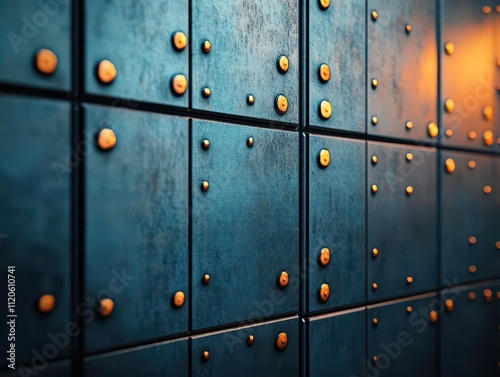 © taweesak, Fototapeta premium Industrial steel wall with rivets and scratches, moody lighting, cyberpunk atmosphere, 3D render