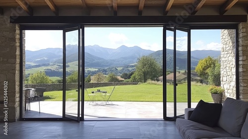 © Pannee, Fototapeta premium Industrial-style folding doors with metal frames and large glass panes.