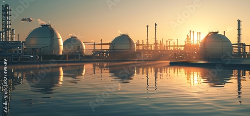 Fototapeta premium Industrial Sunset: Refinery Facility with Gas Storage Tanks