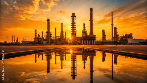 Fototapeta premium Industrial Sunset Reflection over Oil Refinery with Tall Structures and...