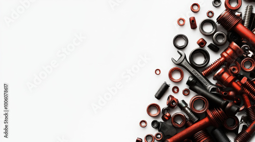 © AngrySun, Fototapeta premium Industrial template, mix of cylinders, bolts and nuts, wrench on light background. Copy space. Generative AI
