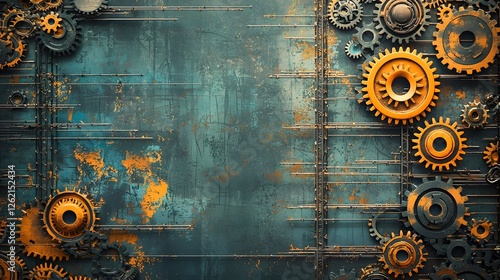 © vanilnilnilla, Naklejka premium Industrial-Themed Background with Faded Mechanical Gears and Scaffolding Patterns