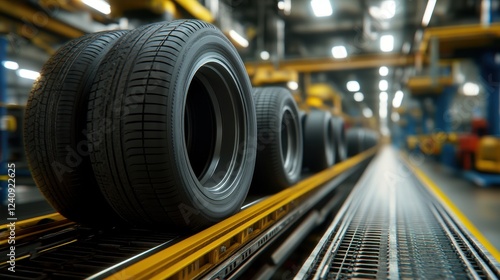 Fototapeta premium Industrial Tire Production Process on a Conveyor Belt in a Modern Factory...