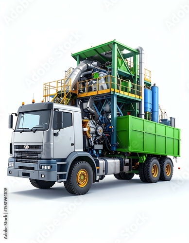 Fototapeta premium Industrial Truck with Complex Machinery and Green Container on White Background