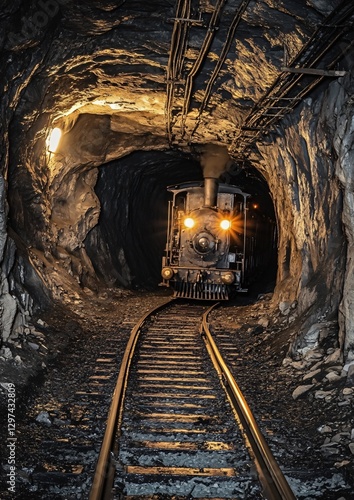 Naklejka premium Industrial underground train in black coal mine tunnel with dramatic lighting