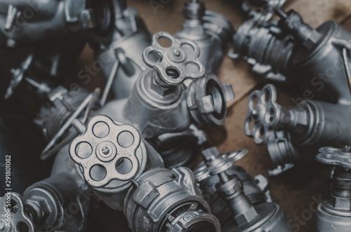 Fototapeta premium Industrial valves with red wheels. close-up of pipe valve connection