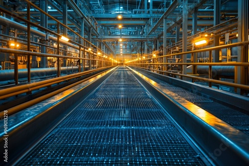 Fototapeta premium Industrial Walkway with Metal Grating and Yellow Handrails