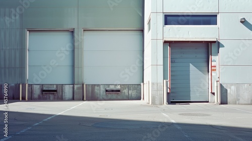 Fototapeta premium Industrial warehouse exterior with large roller doors and a minimalist...