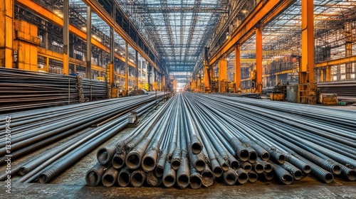 Obraz premium Industrial warehouse filled with steel rods under artificial lighting with an...