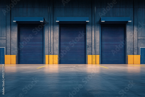 © wasan, Obraz premium Industrial warehouse interior featuring three large dark blue roller doors and polished concrete floor, perfect for storage or logistics.