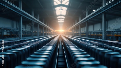 © Khuefa, Naklejka premium Industrial warehouse interior with rows of cans and sunlight streaming in from the ceiling.