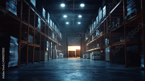 Fototapeta premium Industrial Warehouse Interior with Shelves and Boxes