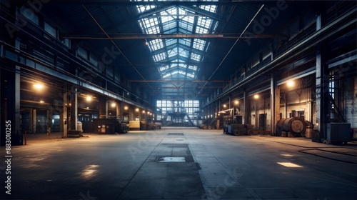 Fototapeta premium Industrial Warehouse Interior with Vintage Machinery and Dramatic Lighting