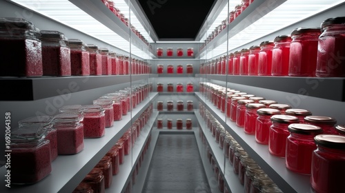 © Juan, Fototapeta premium Industrial warehouse shelves with rows of red jars organized in modern storage