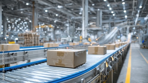 Naklejka premium Industrial warehouse with automated conveyor belt transporting packages in a...
