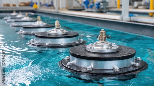 © Sawat, Obraz premium Industrial Water Treatment Process with High-Tech Equipment in Modern Facility Featuring Rotating Mechanical Components and Clear Blue Water Surface