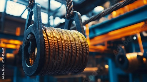 © AZIZAH ART Ai, Obraz premium Industrial wire spool hangs, metallic, golden hues.