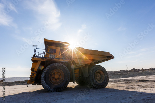 © alexhitrov, Obraz premium Industrial work in an open pit coal mine. A large yellow dump truck is carrying coal soil through the quarry. Open pit coal mining.