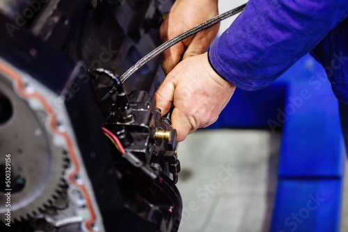 © Mulderphoto, Obraz premium Industrial worker assembles machine, close up