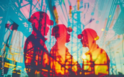 Obraz premium Industrial workers in energy sector close up, focus on, copy space, vibrant colors, Double exposure silhouette with machinery