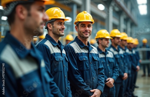 © Pete, Fototapeta premium Industrial workers stand in line in factory. Wear safety equipment, uniform. Workers look attentive, pro in modern industrial setting. Factory workers look proud. Teamwork, safety culture emphasized.