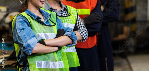 © NVB Stocker, Obraz premium industry engineer team Asian wearing uniform and hard hats at Metal lathe industrial manufacturing factory. Engineer Operating lathe Machinery