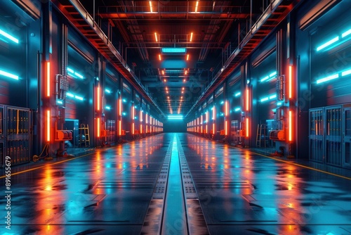 Fototapeta premium Industry 40 tech warehouse, digital goods visualization, futuristic process, blue neon glow, wideangle, hightech design