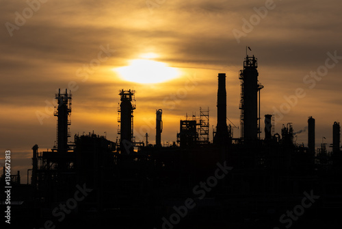 Fototapeta premium Ineos Grangemouth industry complex chimneys fire steam sunset Scotland United...