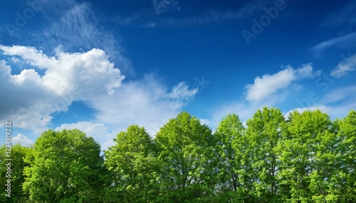 © Brian, Obraz premium inexperienced tree top line over blue sky and clouds historical past in summer time