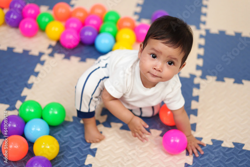 © geargodz, Obraz premium infant baby playing colorful balls in playpen