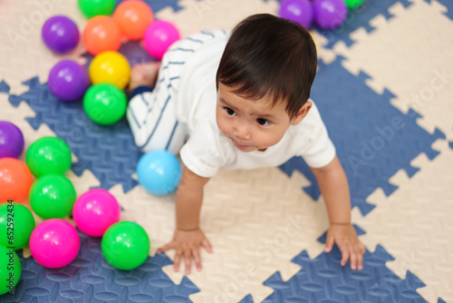 © geargodz, Obraz premium infant baby playing colorful balls in playpen