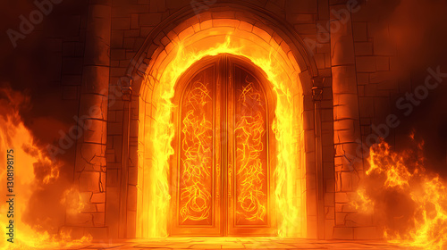 © Thiago, Fototapeta premium Infernal cathedral doors with an unholy glow and arcane inscriptions. Infernal - Volcano. Illustration