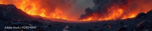 © Temteen, Obraz premium Inferno landscape with debris scattered across a blackened terrain, ruin, explosion