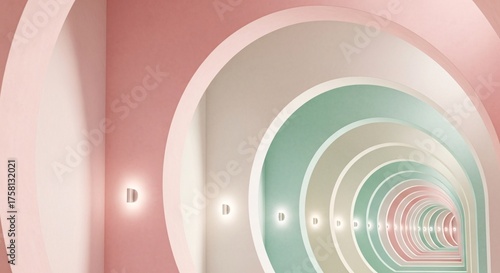 © Fa_art, Obraz premium Infinite Archway Pastel-Colored Tunnels Creating Illusion of Depth, Modern Interior Design, Architectural Series
