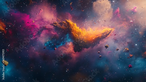 © Keattipoom, Fototapeta premium Infinite Creativity: Art Piece Floating in Cosmic Void Surrounded by Nebulae and Vibrant Textures