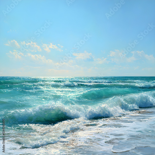 Fototapeta premium Infinite Turquoise: Capturing the Mesmerizing Dance of Ocean Waves Under Azure Skies with Shimmering Sunlit Crests