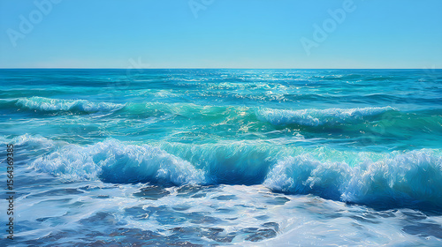 © Eva, Fototapeta premium Infinite Turquoise: Capturing the Mesmerizing Dance of Ocean Waves Under Azure Skies with Shimmering Sunlit Crests