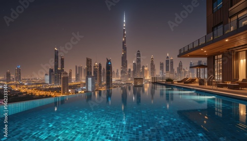 © Soleh, Obraz premium Infinity pool luxury apartment Dubai skyline view