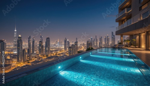 © Soleh, Obraz premium Infinity pool luxury apartment Dubai skyline view