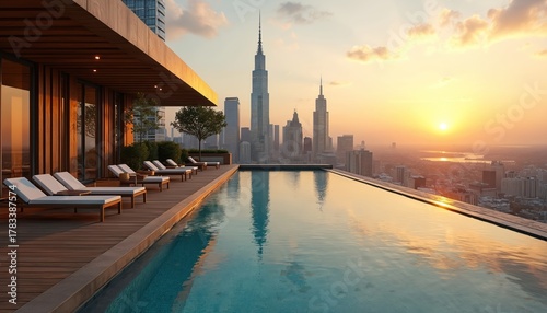 © Viktor, Obraz premium Infinity pool on skyscraper rooftop deck overlooks city skyline at sunset. Lounge chairs sit on wooden floor. Modern urban luxury living, resort vacation relaxation. Cabanas offer shade.