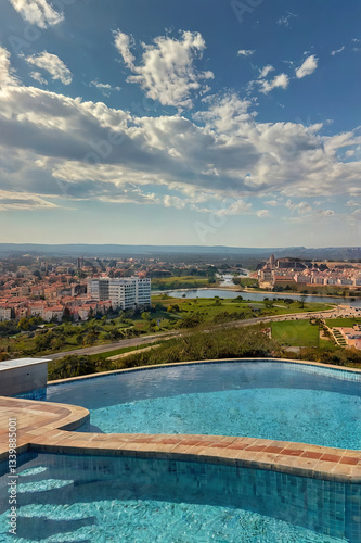 © YuliiaMazurkevych, Obraz premium Infinity Pool Overlooking a Scenic Town and Landscape