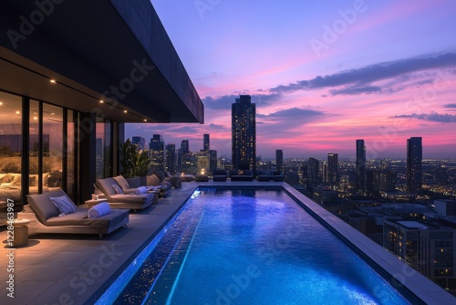 © Andrii Savchuk, Obraz premium Infinity pool overlooking city skyline at sunset