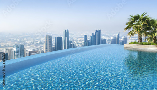 © Putu, Obraz premium Infinity pool with panoramic city skyline view and palm tree in the foreground.