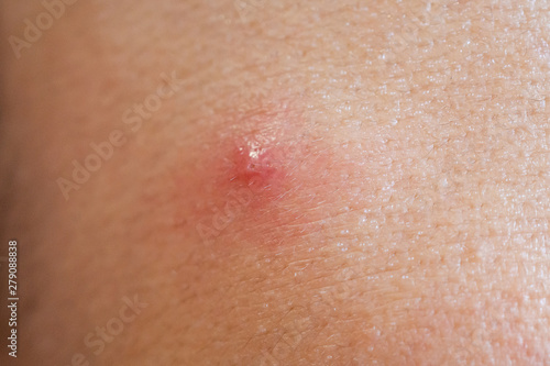 © Kwangmoozaa, Fototapeta premium Inflammatory acne with red spot on face closeup