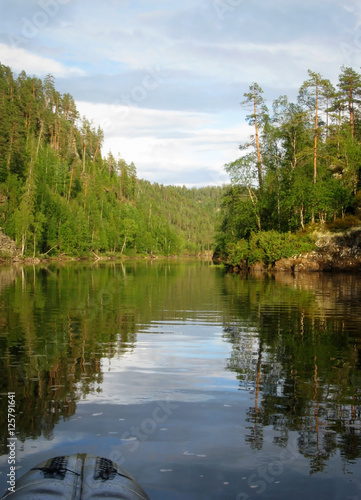 © Mykola Komarovskyy, Obraz premium Inflatable catamaran float on river at summer