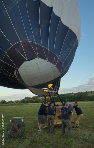 © ReitNN, Obraz premium Inflating a balloon lying on the grass with burning air. A fire burning inside the ball